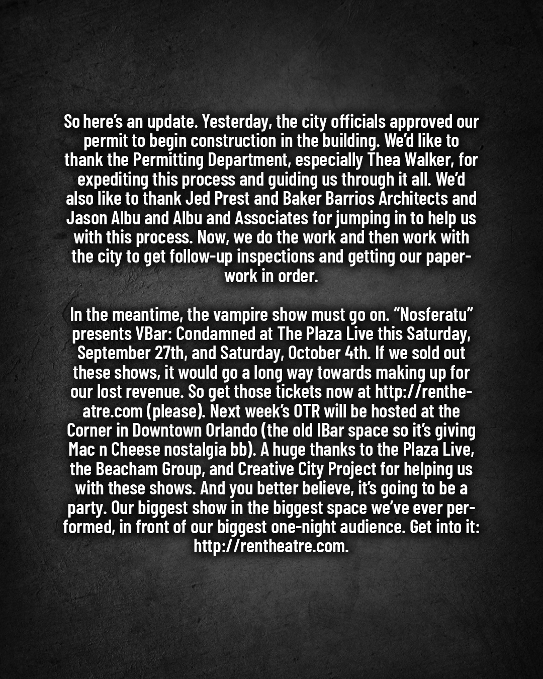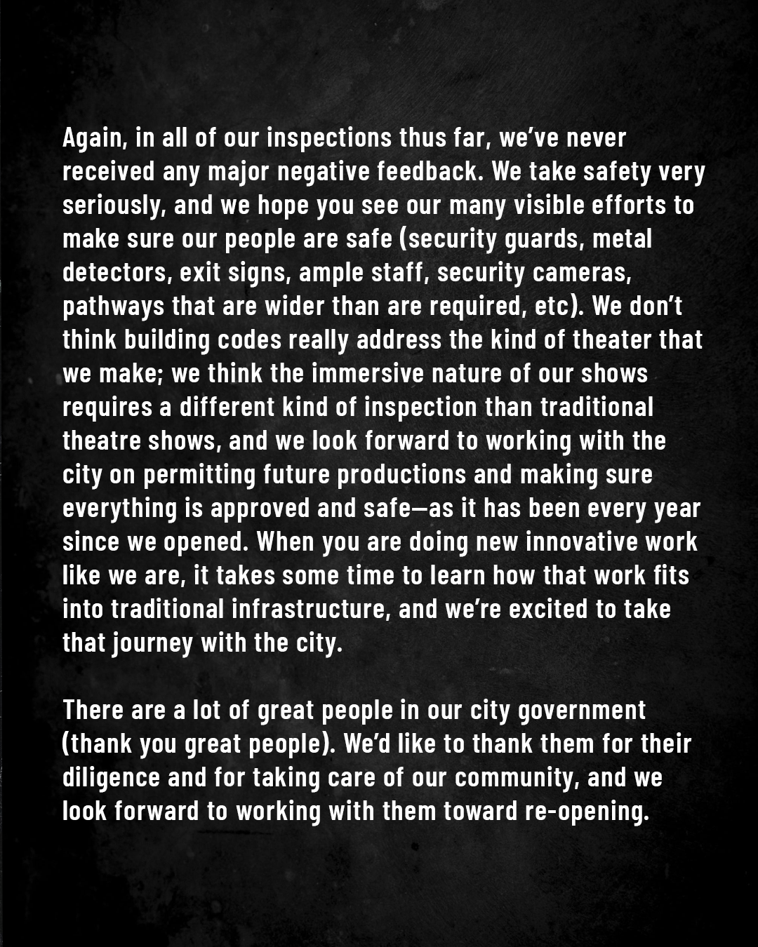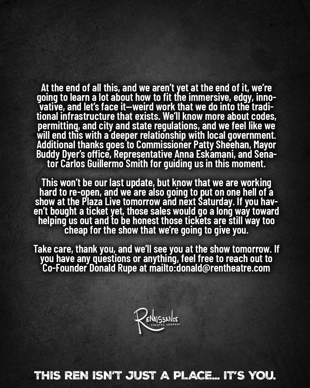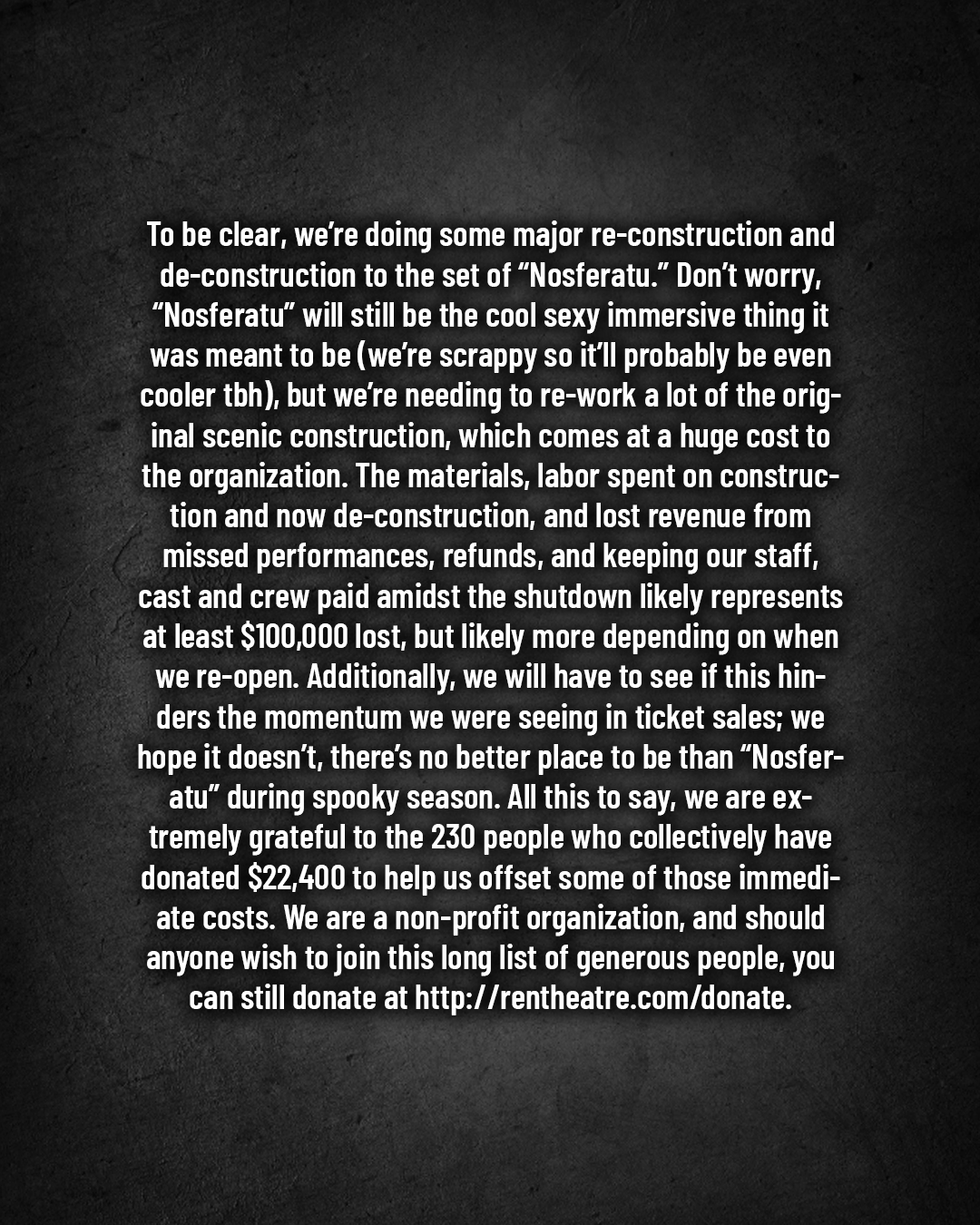 With your support, we have raised $18,500 from over 190 donors. With these donations, we were able to pay our staff and performers for the shows we’ve missed so far. Thank you so much for showing us what community looks like.