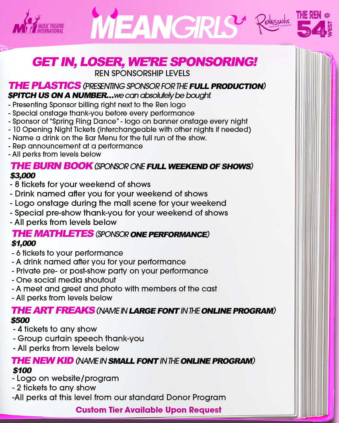 Yes, the Ren is doing a(nother) published musical, but this one is fetch. We're proud to present the Regional premier of Tina Fey's hit movie turned musical turned movie-musical. This show is *perfect* for our temporary downtown location. So grabyour clique, you better wear pink, and get into it, babes.
